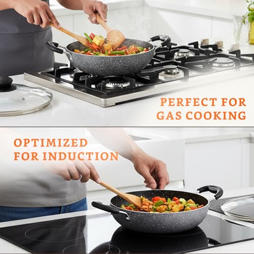 Amazon Solimo Non-Stick Kadai with Glass Lid | Granite Finish | Induction Base | PFOA Free | High Temperature Resistant Exterior Coating | 22 cm |…,