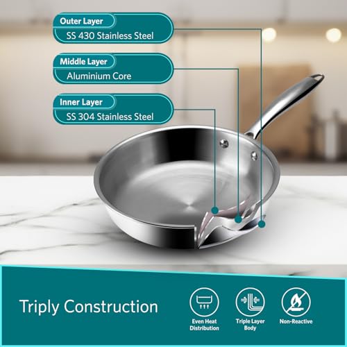 - Premium Triply Stainless Steel Construction โ Crafted with food-grade stainless steel and aluminum core, this stainless steel frying pan delivers even heating, consistent cooking, and prevents hotspots for perfect results.
