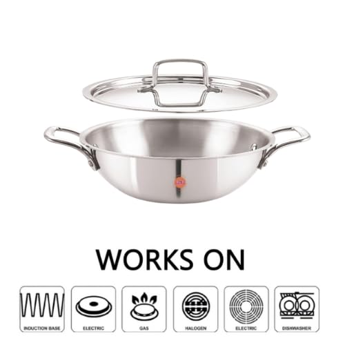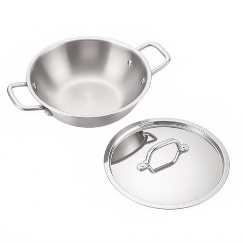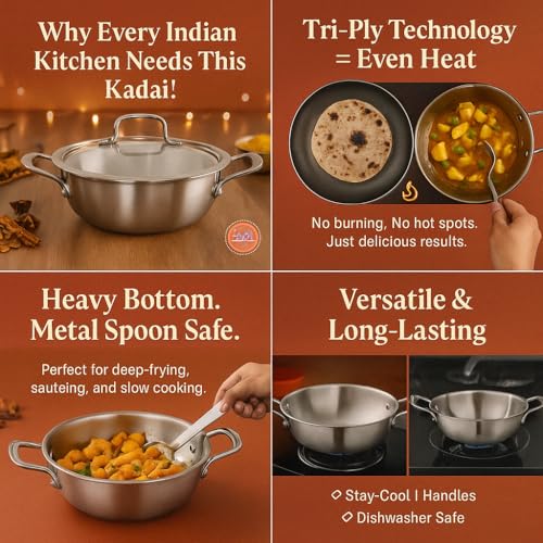 - Tri-Ply Construction for Even Heating: Built with an aluminum core between two stainless steel layers, this kadai ensures uniform heat distribution for faster, energy-efficient cooking with no hot spots
