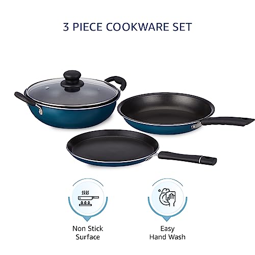 Amazon Brand – Solimo Aluminium – 3 Pcs Non Stick Cookware Sets, Tawa 25 Cm, Kadhai 24 Cm with Glass Lid, Fry Pan 24 Cm (Peacock Green),