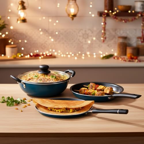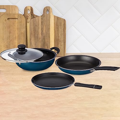 - Package Contents: 3 pcs Non Stick cookware sets (Tawa 25 cm – 1N, Kadhai With Glass Lid 24 cm – 1N, Fry pan 24 cm – 1N)