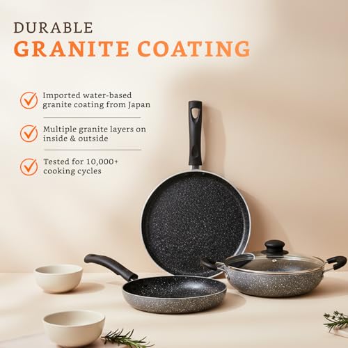 Amazon Solimo Aluminium 4 Piece Non-Stick Cookware Set | Granite Finish | Induction Base | PFOA Free | HTR Exterior Coating | 25 Cm Tawa, 22 Cm…,