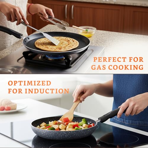 Amazon Solimo Aluminium 4 Piece Non-Stick Cookware Set | Granite Finish | Induction Base | PFOA Free | HTR Exterior Coating | 25 Cm Tawa, 22 Cm…