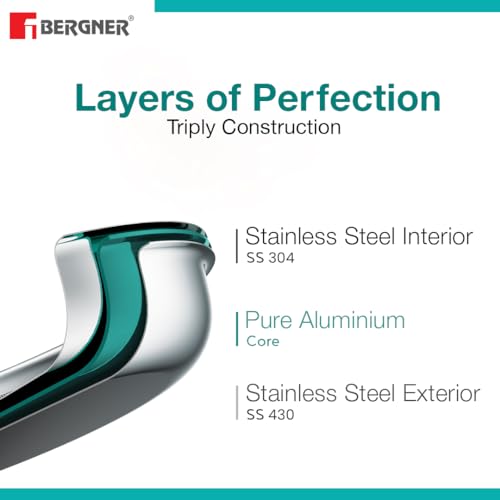 • At amazon.in you can purchase Bergner TriPro Triply Stainless Steel 7 Pcs Cookware Set - 20cm (1.5L) Deep Kadai, 20cm (1.2L) Sautepan, 16cm (1.7L) Saucepan, 20cm (3L) Casserole, 3 Stainless Steel Lids - Induction and Gas Ready for only ₹ 5,099