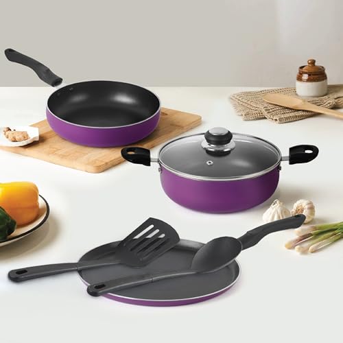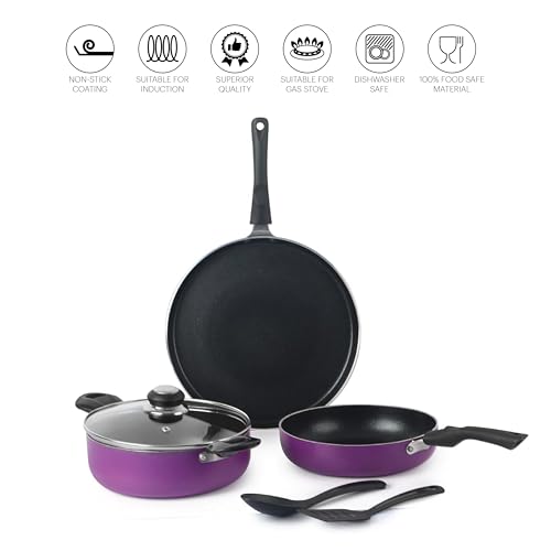 Cello Prima Multipurpose Non-Stick Cookware Set – 6 Pieces | Aluminium | Induction Base | Purple Finish | PFOA-Free | Includes Tawa, Kadai, Fry Pan…,