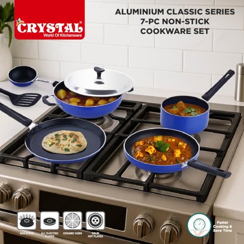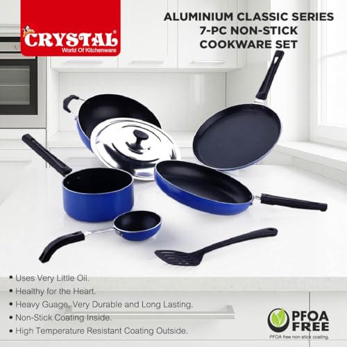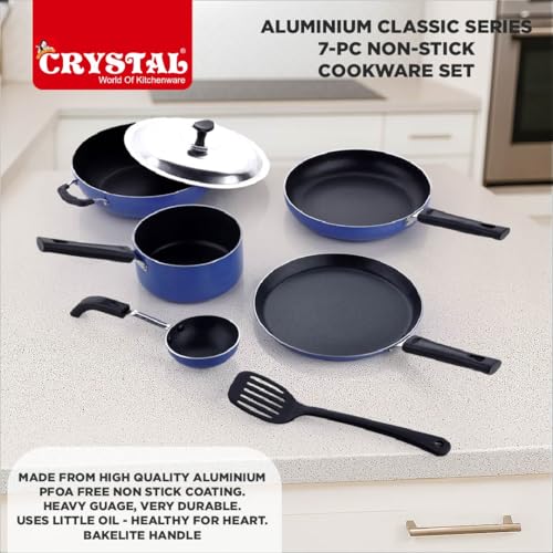 Crystal Classic Series 7-pc Non-Stick Cookware Set, PFOA Free, Tawa, Vagariya, Kadhai with SS Lid, Fry Pan, Sauce Pan, 1 Spatula, Red,