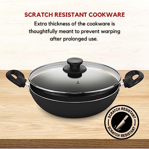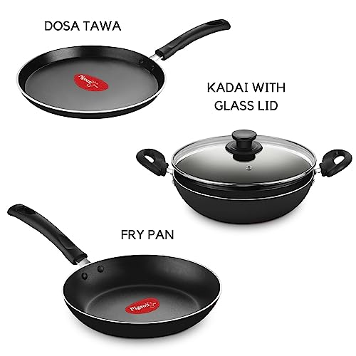 Pigeon Basics Induction Base Non Stick Aluminium Cookware Set, Including Flat Tawa, Kadai with Glass Lid, and Frying Pan (Black),