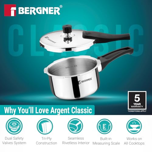 Specification: Bergner Argent Classic Triply Stainless Steel 1 Liter Outer Lid Pressure Cooker, Mini Baby Cooker with Resettable Safety Valve, Sturdy Handle, Easy…