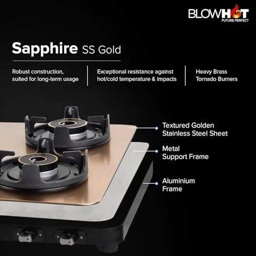 At amazon.in you can purchase BLOWHOT Premium Design ISI Certified Manual 4 Burner Slimmest Gas Stove | Stainless Steel Top | 5 Year Warranty By Blowhot On Burner and Gas Valve - Gold (Sapphire) for only ₹ 8,990