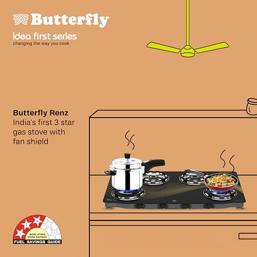 Specification: Butterfly Renz 4 Open Burner 3 Star Glass Top Gas Stove | Fan Shield | Leak Proof European Valve | Rust Resistant Frame | Patented Lift Lock | 8Mm…