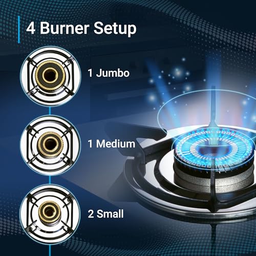 - High Efficiency Brass Burners: Features 4 powerful burners (1 Jumbo, 1 Medium, 2 Small) for faster, even heat distribution – perfect for Indian cooking styles.