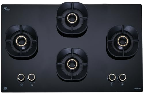 Specification: Elica 90cm 4 Burner Auto Ignition Hob | CROWN FLEXI 491 LOTUS IND HD BRASS | SABAF Triple Ring Brass Burners | 8mm Toughened Glass | Windshield…