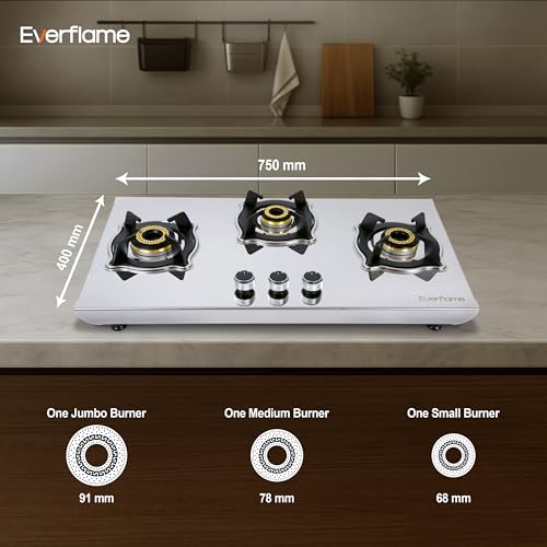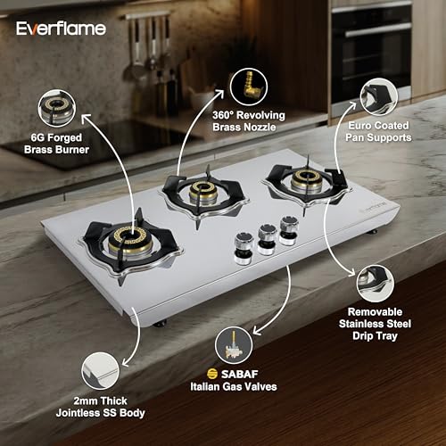 Specification: Everflame Marvel Gas Stove | 3 Burner Steel Stove | 6G Brass Burners | Manual Ignition | Italian SABAF Valve | 5 Years Warranty on (Body & Burners)…