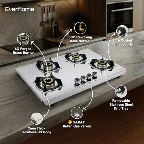 Specification: Everflame Marvel Gas Stove | 4 Burner Steel Stove | 6G Brass Burners | Manual Ignition | Italian SABAF Valve | 5 Years Warranty on (Body & Burners)…