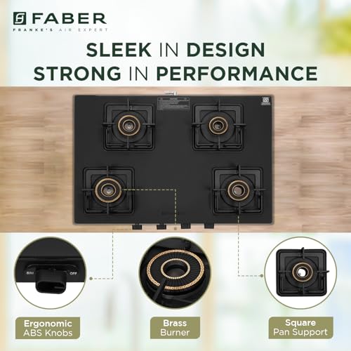 Faber Blossom Black Matt Glass Finish Cooktop| 4 Brass Burners-1Jumbo, 2Medium & 1Small |Manual Ignition | Heavy Pan Support With ABS Knobs | 5Yr…