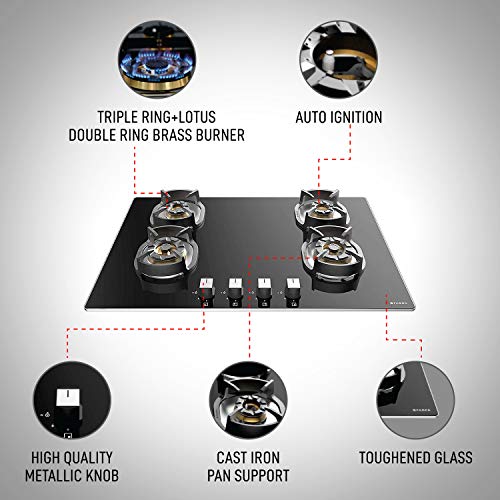 Faber Hob/Hobtop 4 Brass Burner Auto Electric Ignition,Glass Top (Nexus IND HT784 CRS BR CI AI) Black,
