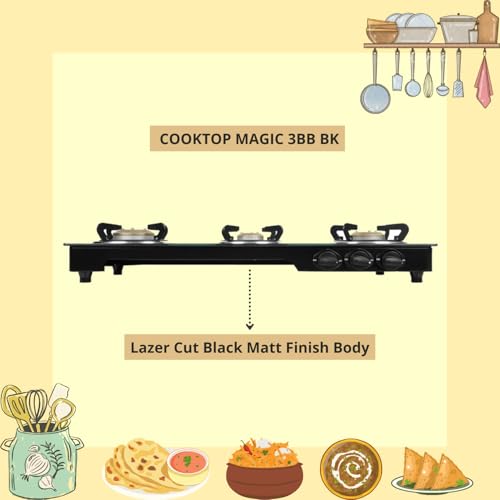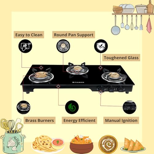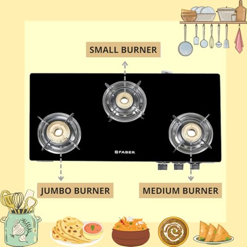 Specification: Faber Magic Glass Top 3 Burner Gas Stove | Brass Burners | 1 Jumbo, 1 Medium & 1 Small Burner | Powder Coated Round Pan Support | Manual Ignition |…