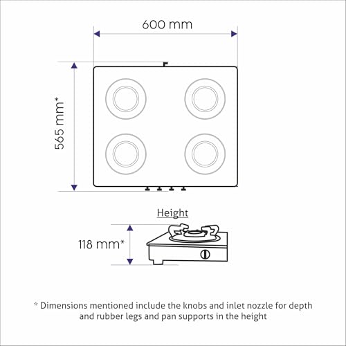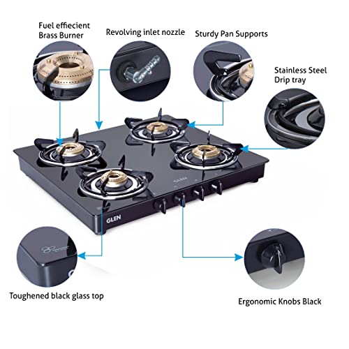 - : Equipped with 4 high-efficiency brass burners (2 big and 2 small), the Glen gas stove ensures fast cooking and fuel savings. The brass burners are designed for even heat distribution, allowing you to cook food evenly.