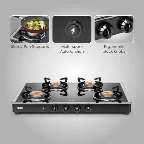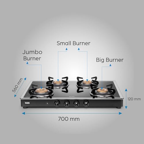 Specification: Glen Apex LPG Gas Stove 4 Burner Auto Ignition | Mirror Finished Glass Top | 1 Jumbo, 1 Medium & 2 Small Forged Brass Burners | 2 Year Warranty |…