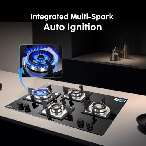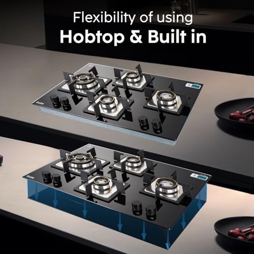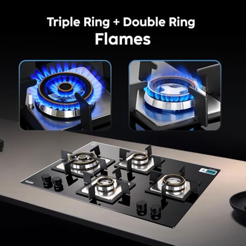 Specification: Glen Built In Hob 4 Burner Gas Stoves Auto Ignition 8 MM Toughened Glass Black Forged Brass Burner with Double Ring Flame Hob Gas Stove 4 Burner
