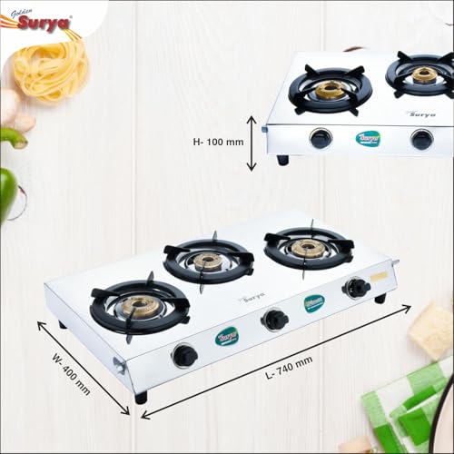 GOLDEN SURYA 3 Burner Gas Stove, Premium Stainless Rust Proof Frame, 3 Brass Burners, Manual Ignition, 18 Months Warranty, BIS Certified -(Trimax)