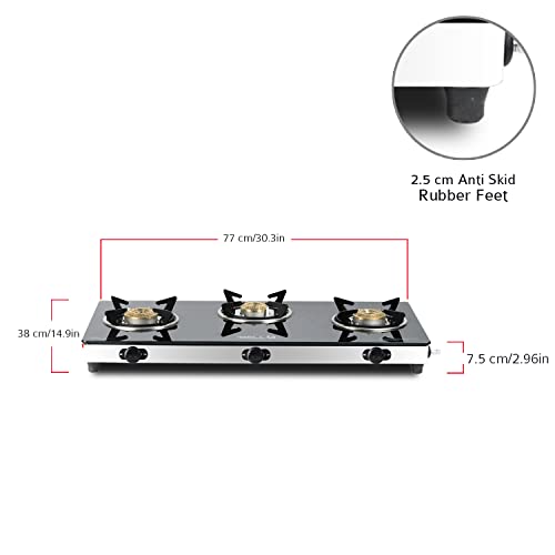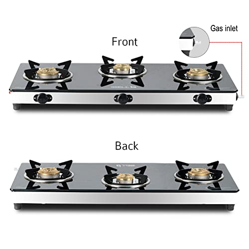 iBELL AGS9413SLM 3 Burner Gas Stove with Auto Ignition, Square Pan Supports, 7mm Toughened Glass Top, Large Size (77 x 38 x 7.5 cm, Black, Tempered…