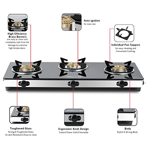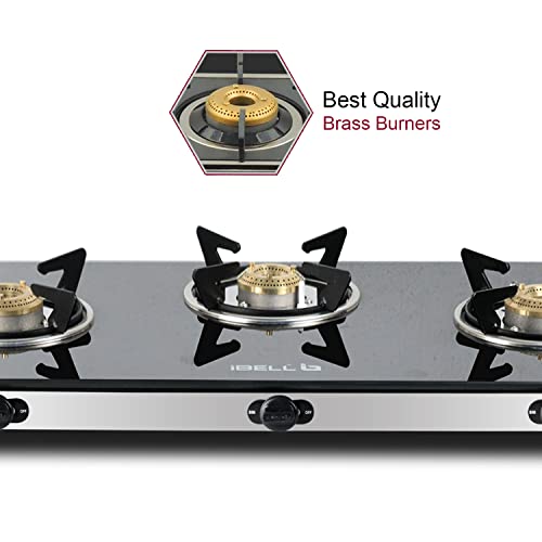 iBELL AGS9413SLM 3 Burner Gas Stove with Auto Ignition, Square Pan Supports, 7mm Toughened Glass Top, Large Size (77 x 38 x 7.5 cm, Black, Tempered…,