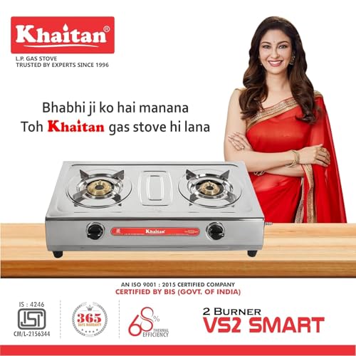 Khaitan 2 Burner VS2 Smart Stainless Steel Premium LP Gas Stove Manual Ignition with 100% Brass Burner (Silver, ISI Approved)