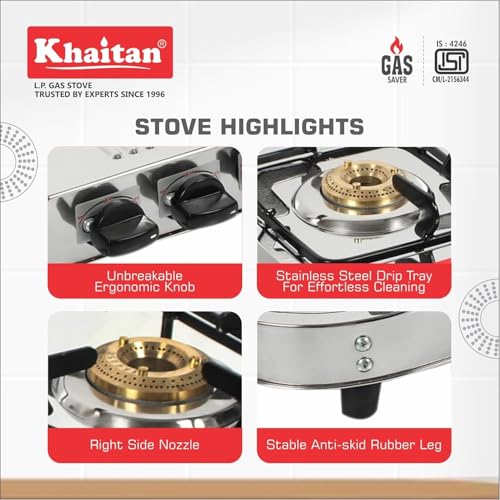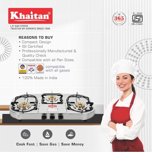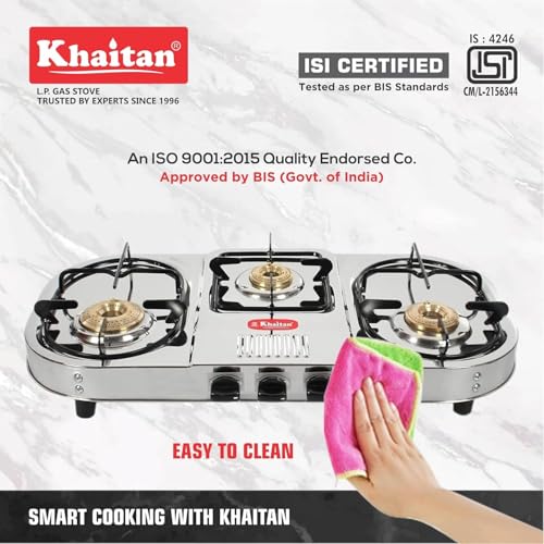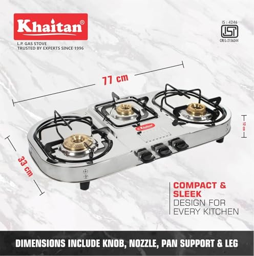 Specification: Khaitan 3 Burner Draw Double Decker (with party cooking burner) Stainless Steel Manual Gas Stove (3 Burners)
