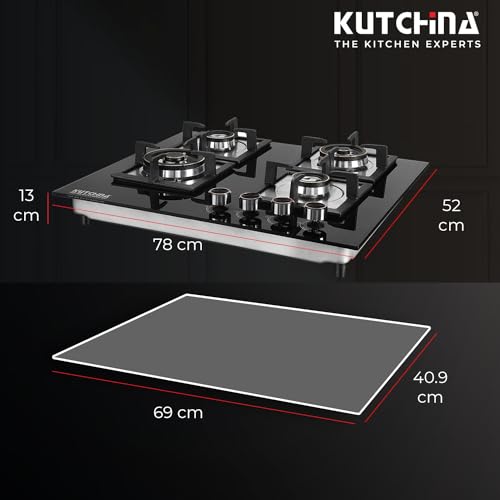 - DIMENSIONS | HYBRID DESIGN :The dimensions of this hob gas stove 4 burners (78x52x13 cm) are meticulously crafted to optimize countertop utilization without compromising on performance. The ideal countertop cutsize for this 4 burner gas stove is 69×40.5 cm. The hybrid design integrates cutting-edge technology with aesthetic appeal, featuring a blend of mild steel and tempered glass for a contemporary finish.