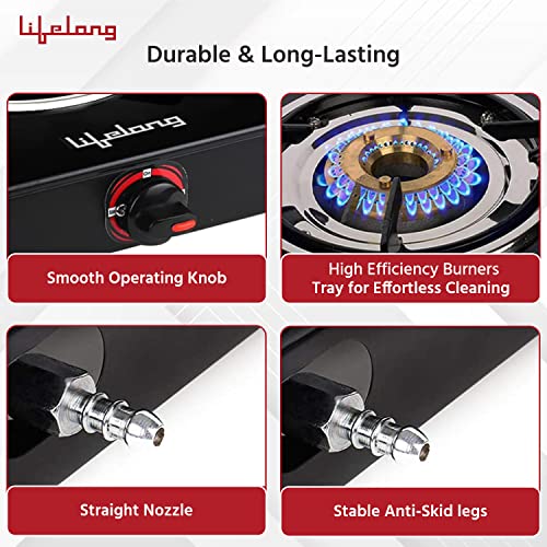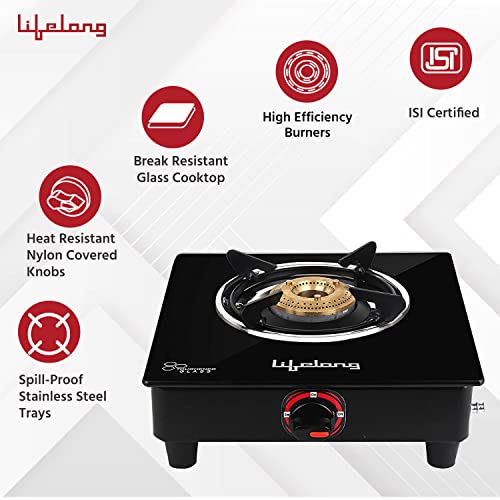 Lifelong LLGS201 Open Single Burner Glass Gas Stove (Black, 27 x 29 x 9 cm), Manual Ignition, Black