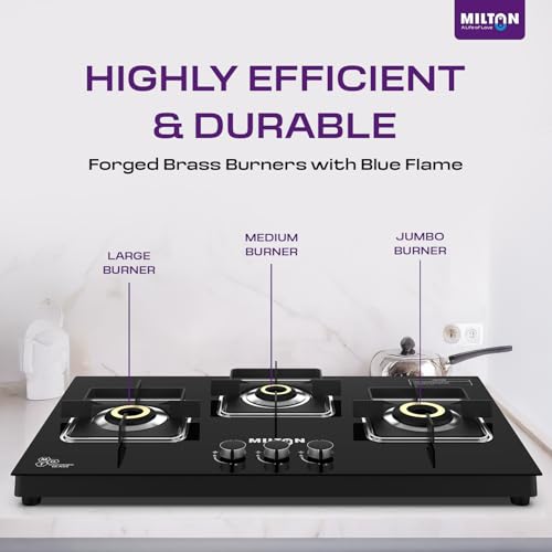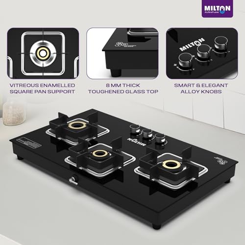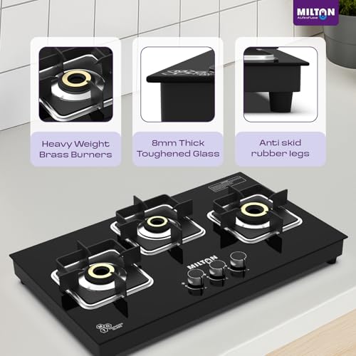 - ✅ Sleek Hob Top Design with 8 mm Toughened Glass & Safety Valves The Milton Elite Hob Top 3 burner gas stove features a premium 8 mm toughened black glass top for a modern, rust-resistant look that’s easy to clean. This glass top gas stove 3 burners model offers a slimline hob top design for space-saving placement and includes high safety valves for consistent gas flow—ideal for long-term, safe cooking.
