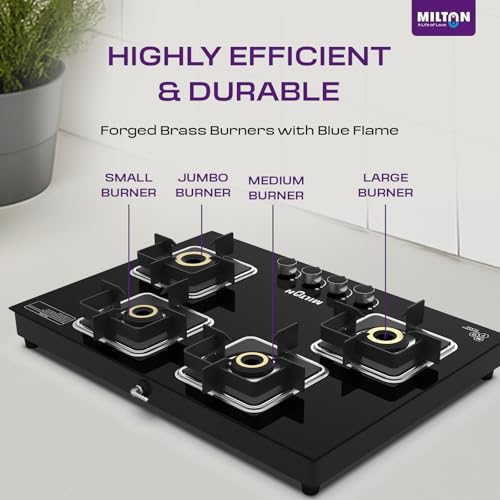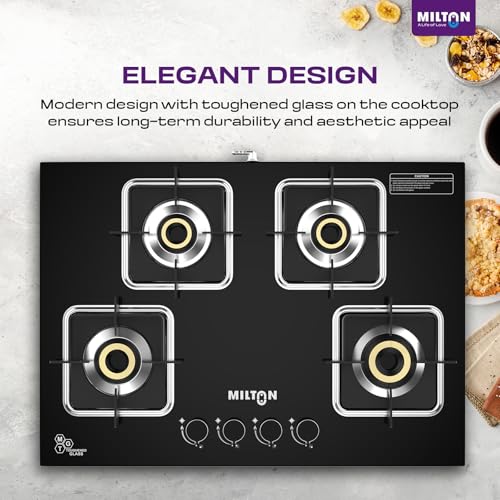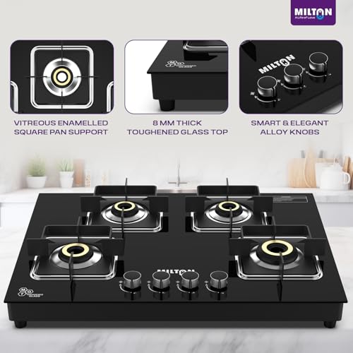 • ✅ Sleek Hob Top Design with 8 mm Toughened Glass & Safety Valves The Milton Elite Hob Top 4 burner gas stove features a premium 8 mm toughened black glass top for a modern, rust-resistant look that’s easy to clean. This glass top gas stove 4 burners model offers a slimline hob top design for space-saving placement and includes high safety valves for consistent gas flow—ideal for long-term, safe cooking.