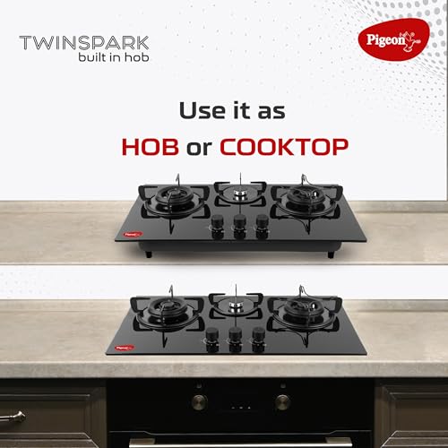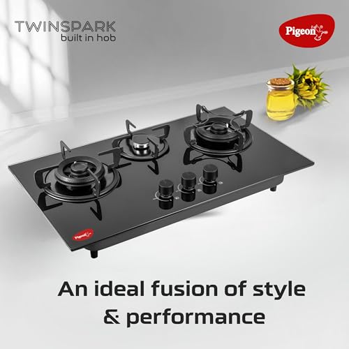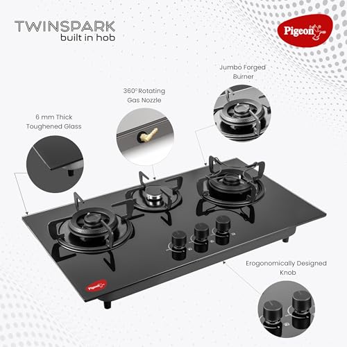 Pigeon Twinspark Hob 3 Burner Multi Spark Integrated Auto Ignition With Forged Burners, Scratch Resistant 6 mm Thick Toughened Glass Top For Easy…,