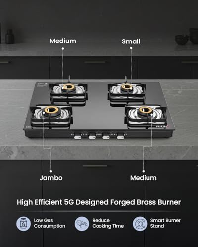 Sujata Classic Gas Stove | 9 Years Warranty | 4 Burner Gas Stove Glass Top, SABAF, ISI Certified, LPG & PNG Compatible, Jumbo Brass Burner (Black)