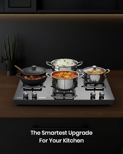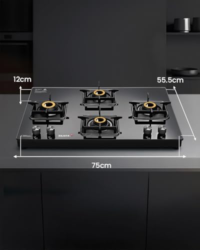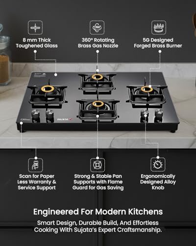 Sujata Cross Gas Stove | 9 Years Warranty | 4 Burner Gas Stove Glass Top, SABAF, ISI Certified, LPG & PNG Compatible, 360° Rotating Brass Gas…