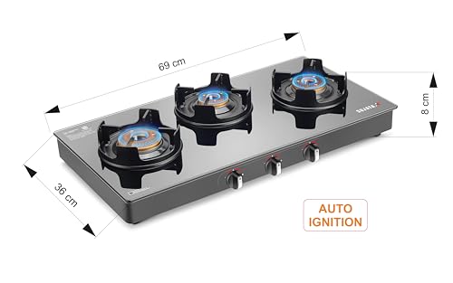 Sujata Deluxe Auto Ignition Gas Stove | 9 Years Warranty | 3 Burner Gas Stove Glass Top, Stove 3 Burner, SABAF, ISI Certified, LPG & PNG…