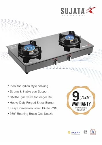 Set Alert for Product: Sujata Deluxe Auto Ignition Gas Stove | 9 Years Warranty | Stove 2 Burner, SABAF, ISI Certified, Glass Top, LPG & PNG Compatible, Brass Burner (Black) - Rs. 6,471