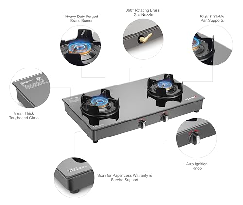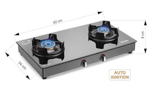 Sujata Deluxe Auto Ignition Gas Stove | 9 Years Warranty | Stove 2 Burner, SABAF, ISI Certified, Glass Top, LPG & PNG Compatible, Brass Burner (Black)