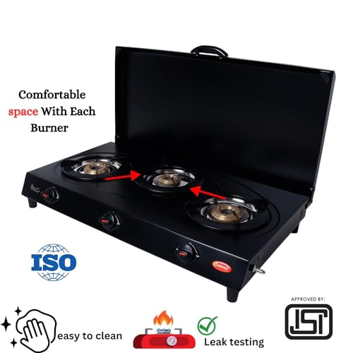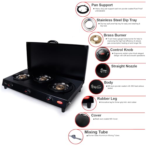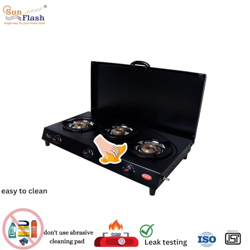 Specification: Sun Flash Galaxy Cat Lx 3 Burner Gas Stove Euro Coated Body Cook top Manual with Black Euro Coated Ms Cover Lid