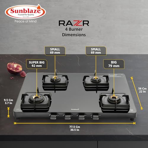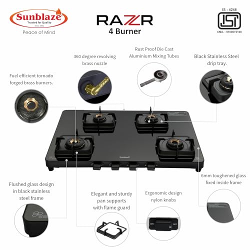 - Premium 4 Burner Glass Gas Stove: Sunblaze Razr 4 burner glass gas stove is designed for efficient multitasking, allowing you to cook multiple dishes simultaneously with ease and convenience.