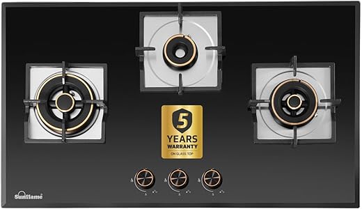 - HIGH EFFICIENCY BRASS BURNERS: Sunflame Hob top features 3 high-efficiency brass burners: 1 jumbo and 1 large burner with triple ring flame, and 1 medium burner with dual ring flame. The dual flame options ensure better blue flame for faster and more efficient Indian cooking. The stylish golden ring detailing adds a premium aesthetic appeal.