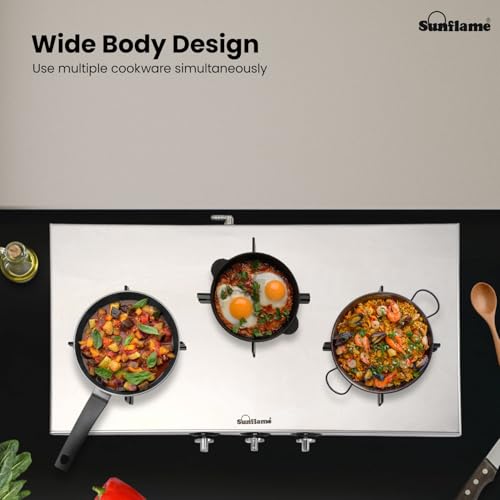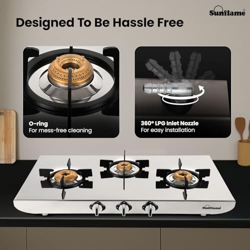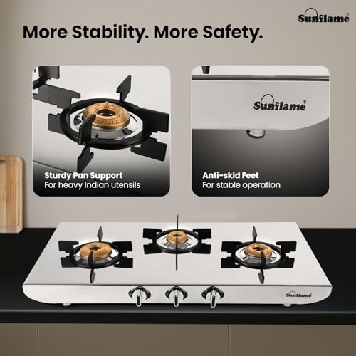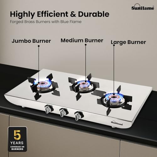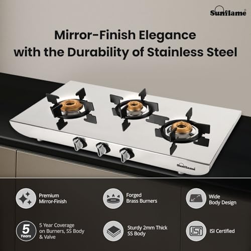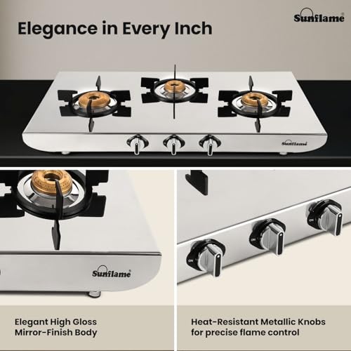 - HIGH-GLOSS MIRROR FINISH: Designed to elevate your kitchen’s look, this Sunflame 3 burner premium gas stove features a stylish stainless steel body with high-gloss mirror finish, offering a premium and polished appearance that stands out.