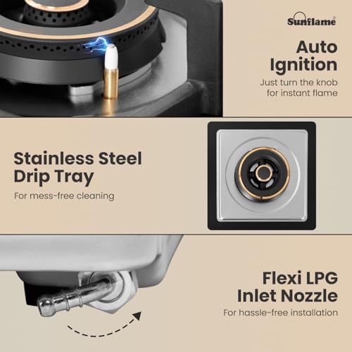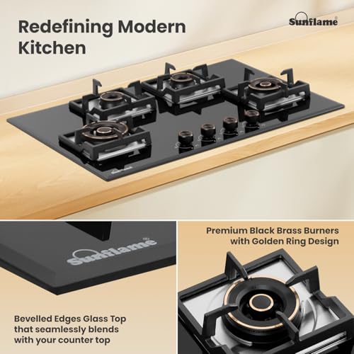 • HIGH EFFICIENCY BRASS BURNERS: Sunflame Hob top features 4 high-efficiency brass burners: 1 jumbo and 1 large burner with triple ring flame, and 2 medium burners with dual ring flame. The dual flame options ensure better blue flame for faster and more efficient Indian cooking. The stylish golden ring detailing adds a premium aesthetic appeal.