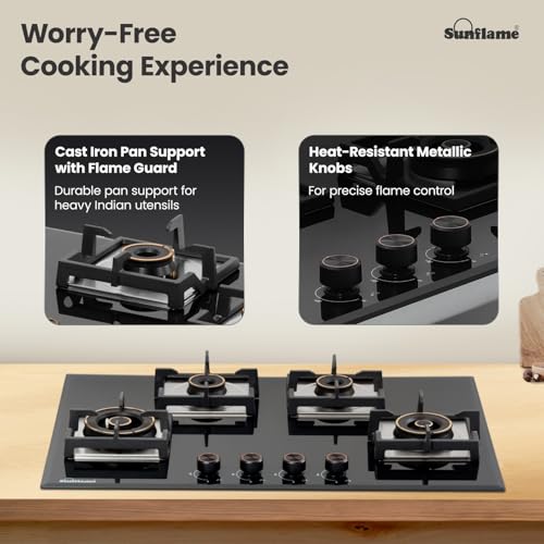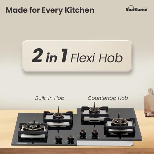 Specification: Sunflame 4 Burner Built-In & Countertop Flexi Hob 78 cm Wide | 5 Year Coverage on Glasstop by Sunflame | Brass Burners with Golden Ring Design |…