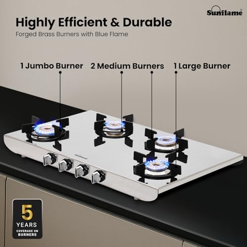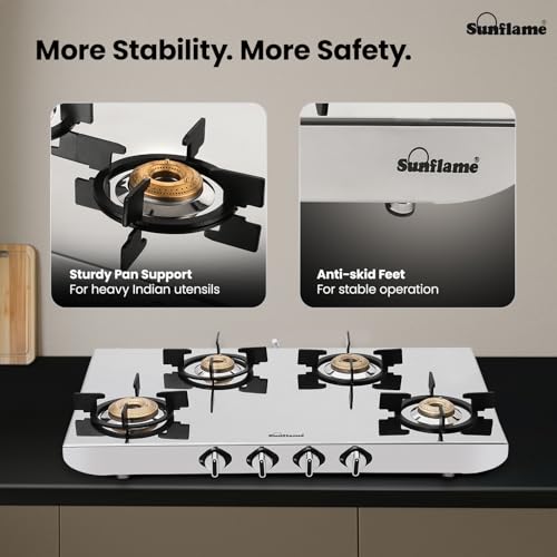 - HIGH-GLOSS MIRROR FINISH: Designed to elevate your kitchen’s look, this Sunflame 4 burner gas stove features a stylish stainless steel body with high-gloss mirror finish, offering a premium and polished appearance that stands out.