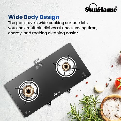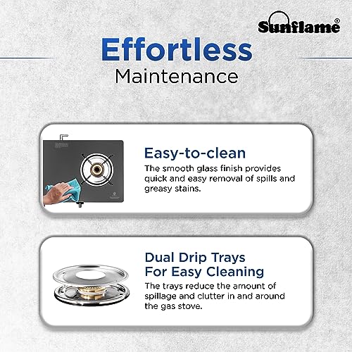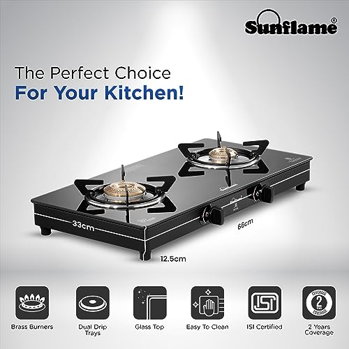 Sunflame Crystal Nova 2 Burner Gas Stove | Dual Drip Trays | 1 Jumbo and 1 Small Brass Burners | 2 Years Product Coverage by Sunflame | Manual…