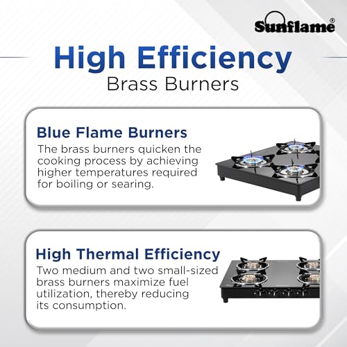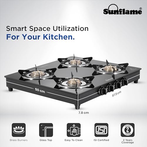 Specification: Sunflame Maleo 4 Burner Gas Stove | Complimentary Lighter | 2 Medium & 2 Small Brass Burners | 2 Year Product Coverage | Toughened Glass Top | PAN…
