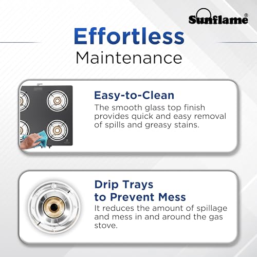 - Space-saving Design: Sunflame Maleo 4 Burner Gas Stove boasts a space-saving design that provides the convenience of cooking on all the burners while adding a modern touch to your kitchen.
