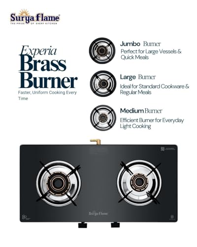 Surya Flame Creta Pro LPG 2 Burner Gas Stove | Experia Burners, Jumbo Burner, HR Coated Heavy Pan Support | Toughened Glass Top | Brass Revolving…,